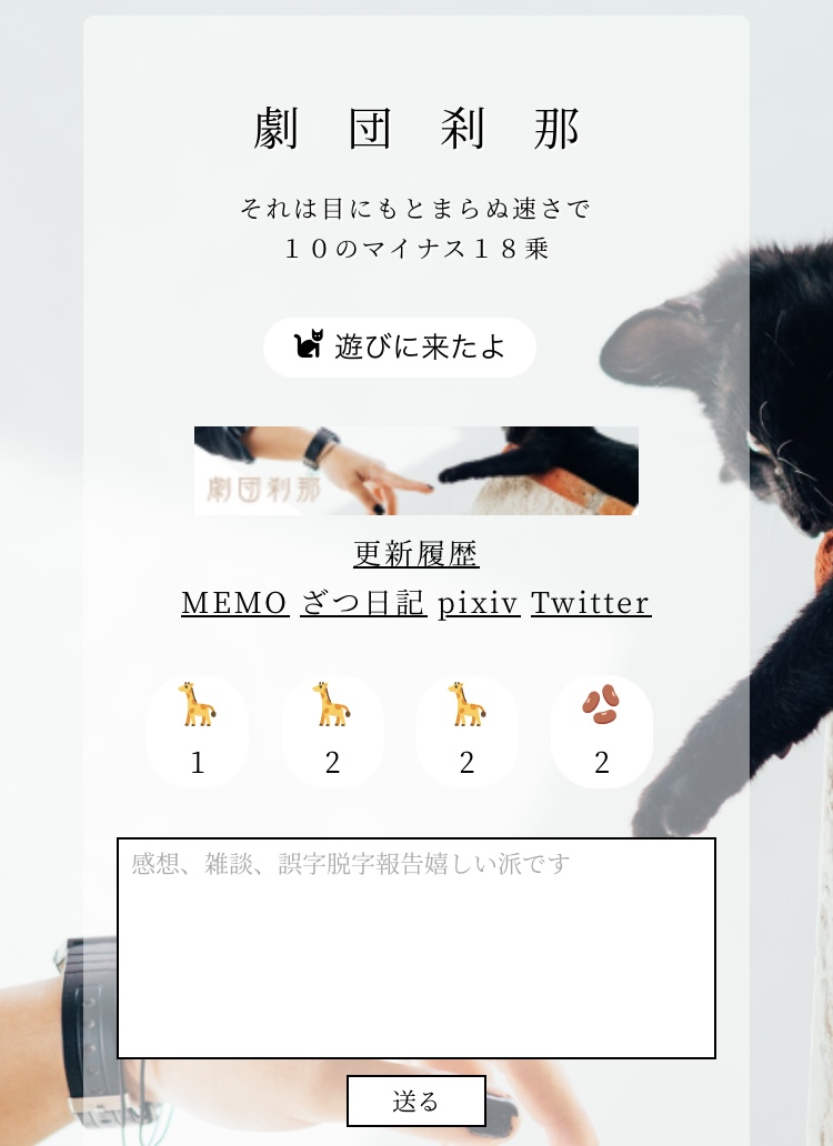 WAVEBOXみたいなものをサイトトップに設置しました。いいねボタンとメールフォームをくっつけただけです。絵文字、四種類全部変えたかったんですが、キリン🦒さん以外思いつかなくて🦒🦒🦒🦒にしちゃった。#追記 7/31 豆本やりてえよお!が高まってひとつだけ「🫘」にしました。