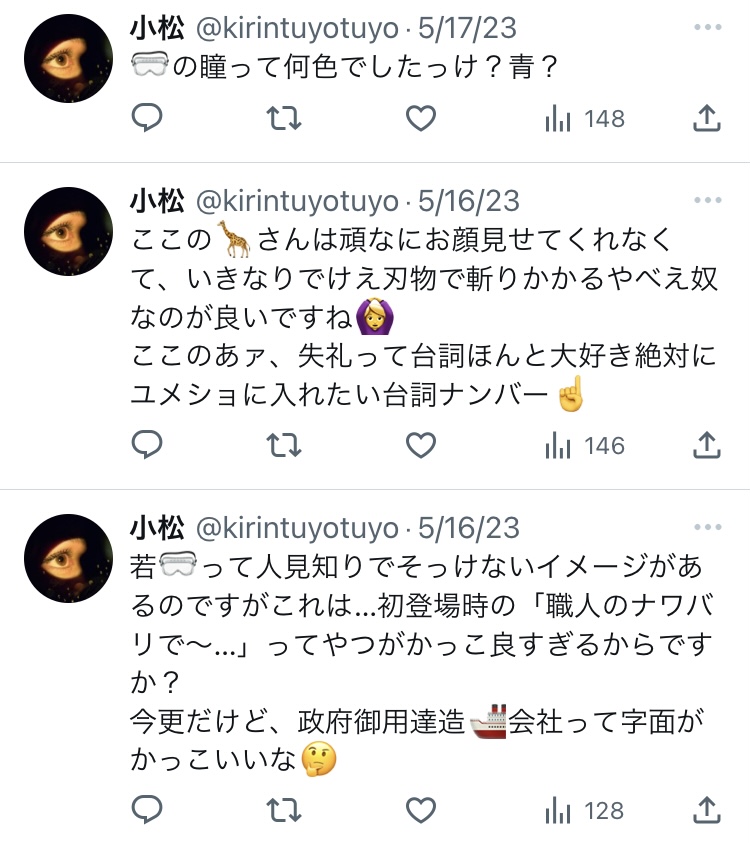 Twitterはワンピ用アカウントと、ずっと使っているプライベート用の鍵垢があるんですが、鍵&フォロワーは十年来の友達っていう環境で慣れてしまったので、いざワンピ垢作ってみてもなかなか思うように使えなくて。