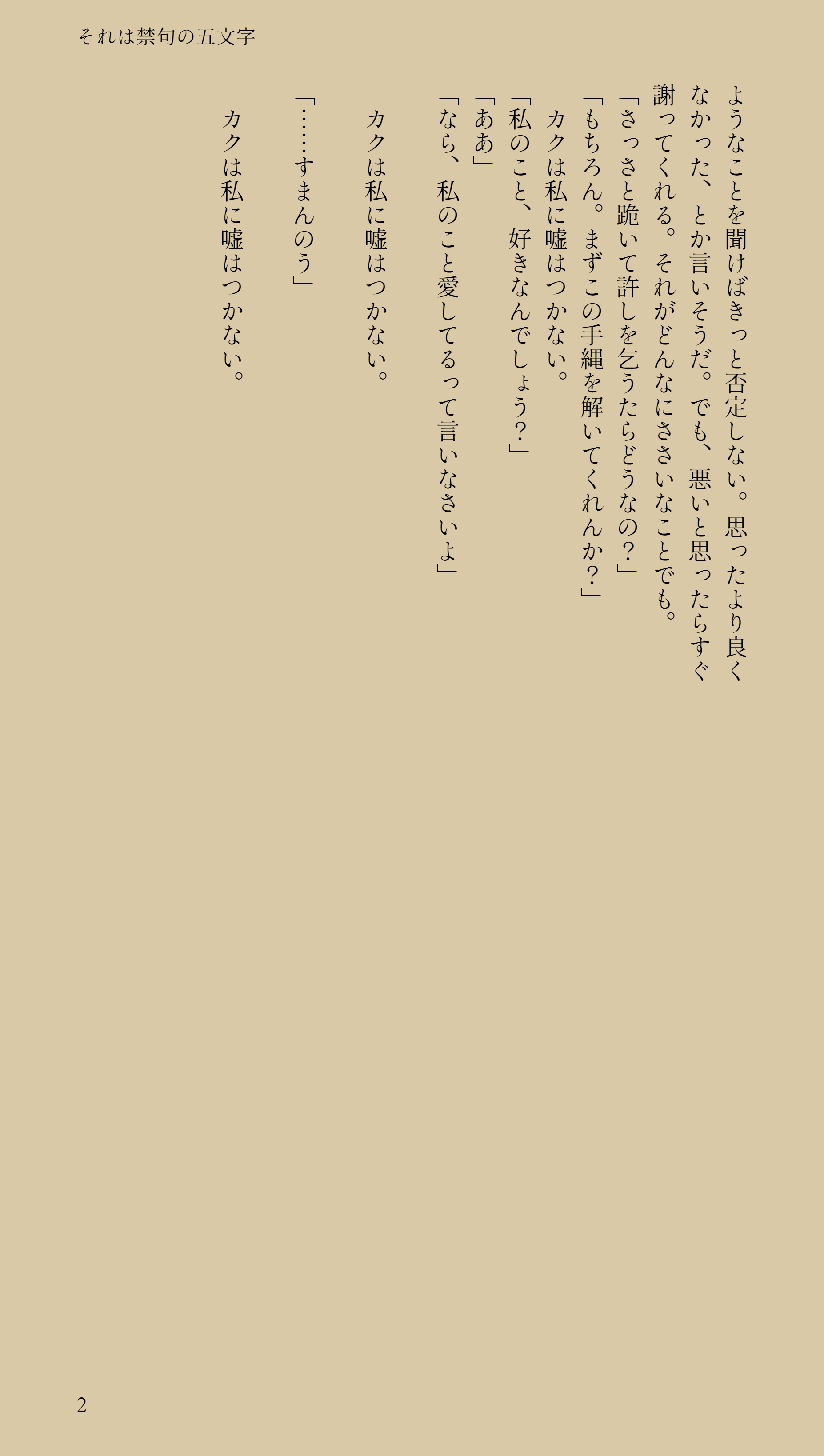 Coccoのカウントダウンを聞いていたので書きたくなりました。カクさんを怒りのままいたぶって「愛してる」と言わせたい話です。PCだと読みづらいですよねすみません! #掌編 favorite いいね No.498 2024/02/10(Sat) 20:23 86 字
