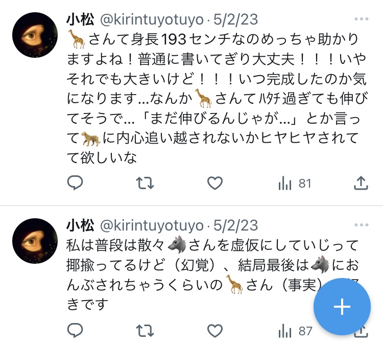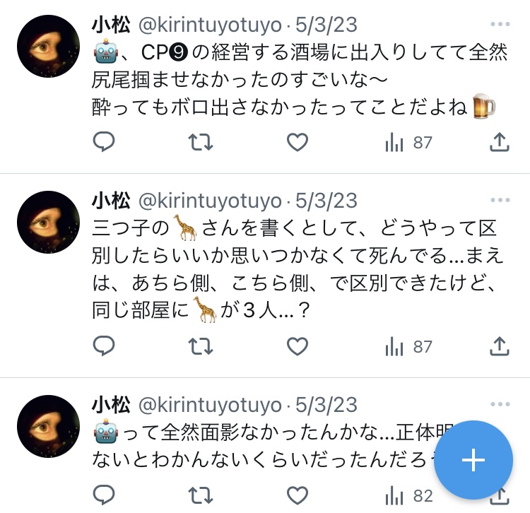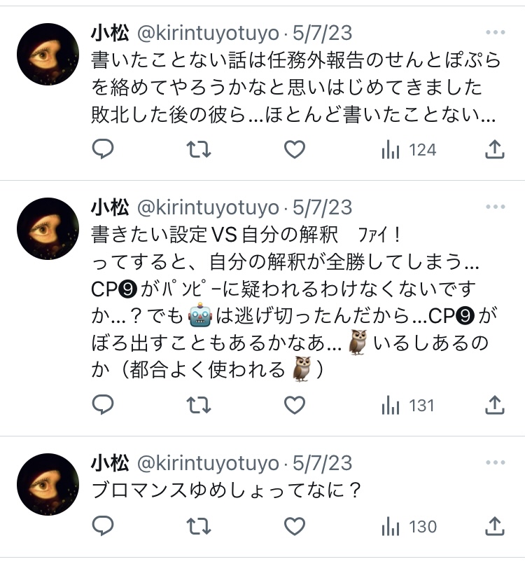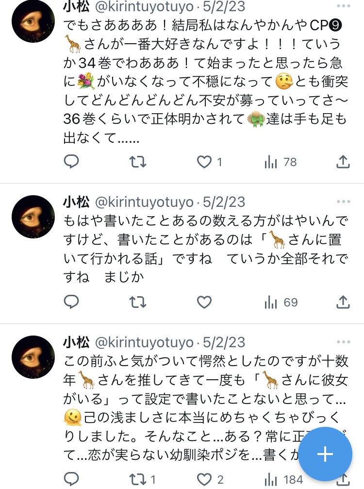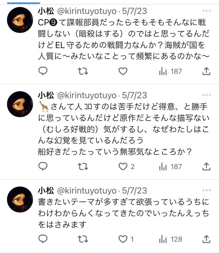 Twitterはワンピ用アカウントと、ずっと使っているプライベート用の鍵垢があるんですが、鍵&フォロワーは十年来の友達っていう環境で慣れてしまったので、いざワンピ垢作ってみてもなかなか思うように使えなくて。