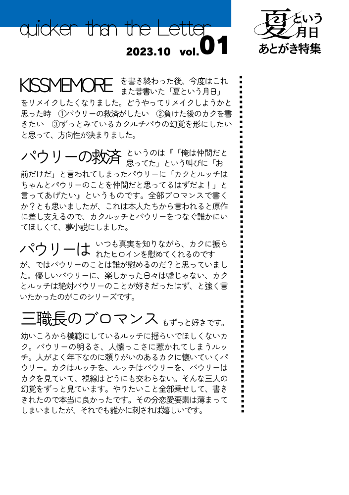 #夏という月日 のあとがきフリーペーパーをつくるぞ!と思ってCanvaで頑張っています。レイアウト?試行錯誤中。テキストボックス配置するの大変だよ~~~と思いますが、せっかく課金したのでCanvaで頑張ってみたい所存。まだ途中なので謎の空白があり〼