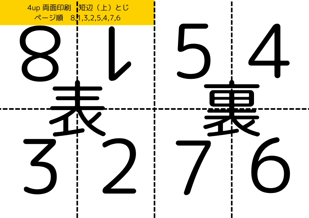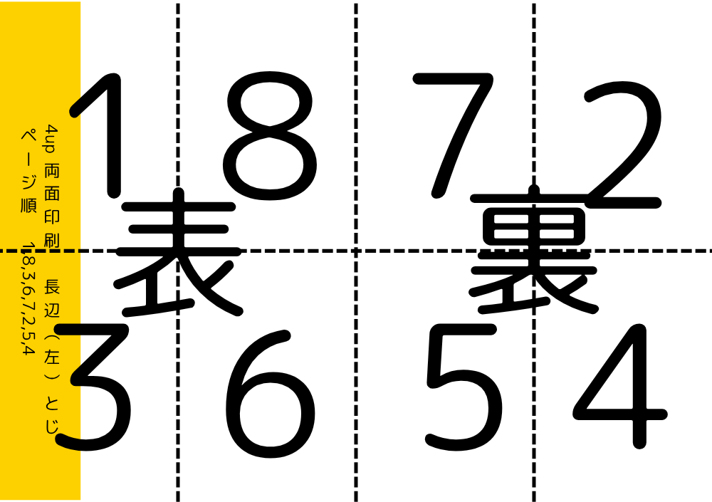 WordとCanva※で作る折本(両面印刷・4つ折り)と中綴じ糸綴じ本が出来ました! 出来た~~~~!!!やった~~~~~!!!!!忘れないうちにメモしておきます。 ※私が表紙を作るペイントソフトとしてcanvaを使ってるだけで、表紙・裏表紙もテキストだけなら全部Wordでいける! 折本(両面印刷・四つ折り) ※縦書き・右綴じの場合です A4用紙に印刷して四つ折りでA6(文庫)サイズになります。#追記 ① Wordで本文を組んでおく 今回はA6サイズ・2段組にしました。 余白は上下18㎜、左右8mm フォントサイズ 10pt、行間は固定14ptにしました。 → 本文が6頁におさまりました。 表紙・裏表紙分は空き頁にしておいて全部で8頁になります。 ② 表紙と裏表紙をCanvaで作成する 後でページごとに並び替えるので、A6サイズで作ります。 (見開きサイズで作らないよう注意) ③ ②で作った表紙と裏表紙をダウンロード(PNG)する ④ ①に③でダウンロードした表紙と裏表紙を挿入します。 1頁目に表紙、8頁目に裏表紙です。 挿入したら、表紙と裏表紙は上下さかさまにします。 ⑤ 両面印刷設定をします。 ・両面印刷/短辺(上)とじ ・4up印刷 ・ページ順は8,1,3,2,5,4,7,6 ⑥折ったら出来上がり! すごく簡単な表(参考) 中綴じ糸綴じ本 折本とほぼ同じなので異なる部分だけ ※縦書き・右綴じの場合です A4用紙に印刷して切四つ折りでA6(文庫)サイズになります。 が!A5用紙に冊子印刷すればこんな手間いりません! #追記 ①~③ 割愛 ④ ①に③でダウンロードした表紙と裏表紙を挿入します。 1頁目に表紙、8頁目に裏表紙です。 挿入したら、表紙と裏表紙は上下さかさまにしません。 ⑤ 両面印刷設定をします。 ・両面印刷/長辺(左)とじ ・4up印刷 ・ページ順は1,8,3,6,7,4,5,4 ⑥ 糸で綴じる(割愛) すごく簡単な表(参考) #同人誌・ZINE #備忘 #豆本 いつか気力があったらnoteにでもまとめてみたいな…気力があったら…! favorite いいね No.805 2025/06/22(Sun) 22:17 913 字