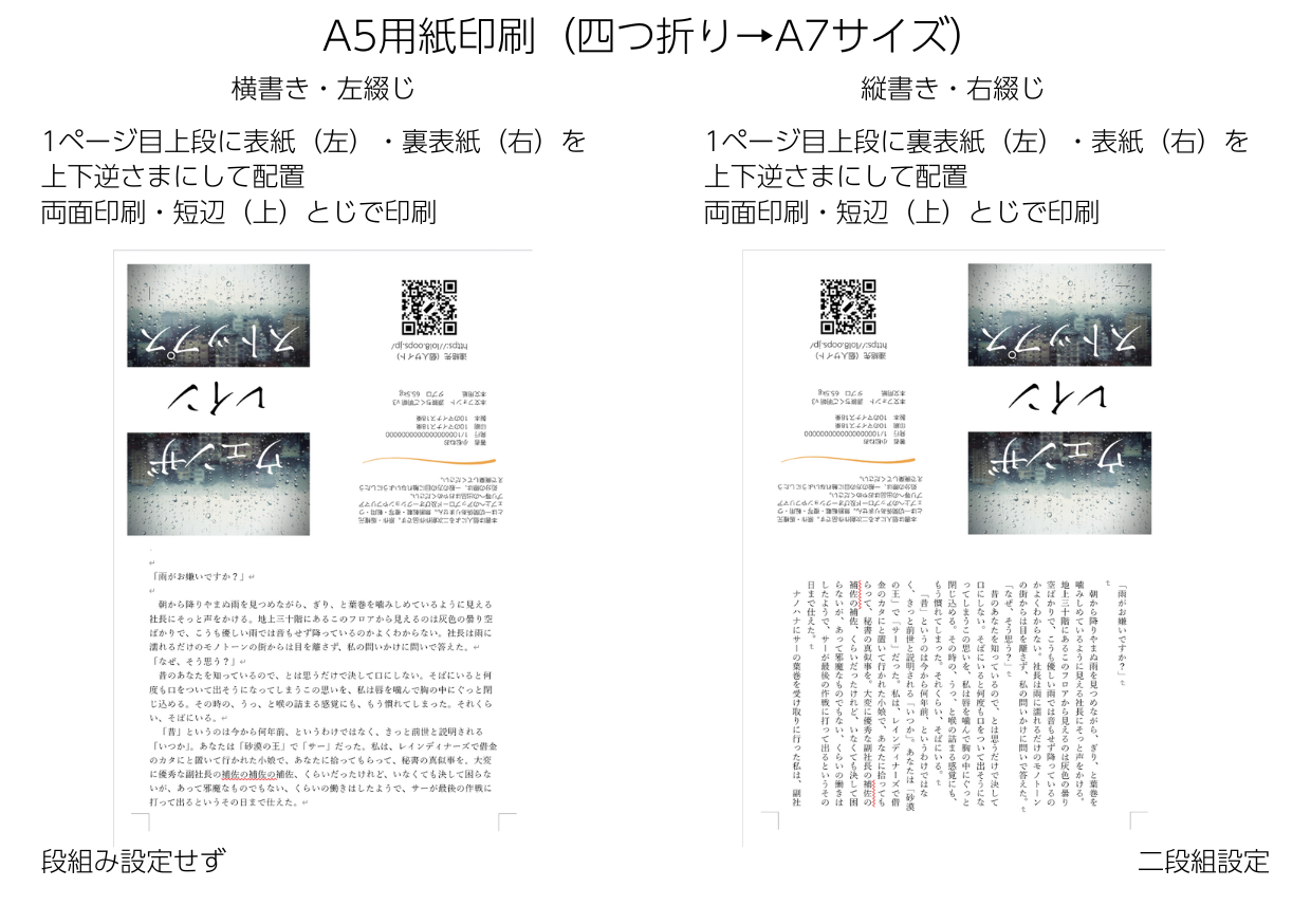 なんだか試作すればするほどしっちゃかめっちゃになってきたので改めて整理します!#同人誌・ZINE #豆本 A5用紙に印刷して四つ折りでA7サイズになる折本ペーパー※ ※折本ペーパーは造語です。四つ折りにするだけなので本というより、フリーペーパーとかパンフレットみたいな感じ。でも一応、表紙と裏表紙をつけてるから本チック。 ※A4用紙に印刷して四つ折りでA6サイズにすることも出来る(その際は適宜サイズを読み替えてください)。 ※この時のやり方は「A6サイズで二段組」を叶える方法です。 【Wordの設定】 ・用紙はA5(148mm × 210mm)サイズ ・縦書き/右綴じなら二段組がレイアウトしやすい ・横書き/左綴じなら段組み設定不要 ・余白やフォントサイズ等はお好みで 私の設定だと1,500字くらいまで収録できそうでした。 【表紙・裏表紙】 ・A7(74mm×105mm)サイズで表紙・裏表紙をそれぞれ作成する または ・A6(105mm×148mm)サイズで表紙・裏表紙を並べて作成する。 ※並べて作る場合は縦書きか横書きかで左右どちらに表紙(1ページ目)を配置するかが変わるので注意 【レイアウト】 【印刷設定】 ・両面印刷/短辺(上)とじ A5用紙に印刷して二つ折りでA6サイズになる中綴じ冊子 the・本。綴じ方はホチキスでも糸綴じでもお好みで。私は糸綴じ派です。 【Wordの設定】 ・用紙はA6(105mm×148mm)サイズ ・余白やフォントサイズ等はお好みで 【表紙・裏表紙】 ・A7(74mm×105mm)サイズで表紙・裏表紙をそれぞれ作成する 【レイアウト】 ・特段なし 【印刷設定】 ・冊子印刷を選択する ※この時のやり方は「A4用紙に印刷(面付け)してA6サイズの冊子を作る」方法です。 favorite いいね No.807 2025/06/23(Mon) 17:52 780 字